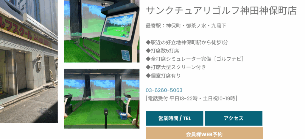 公式サイト | https://golfperformance.jp/school/akihabara/ | https://s-style-golf.com/ | https://range.sanctuarygolf.jp/locations/jinbocho/ |