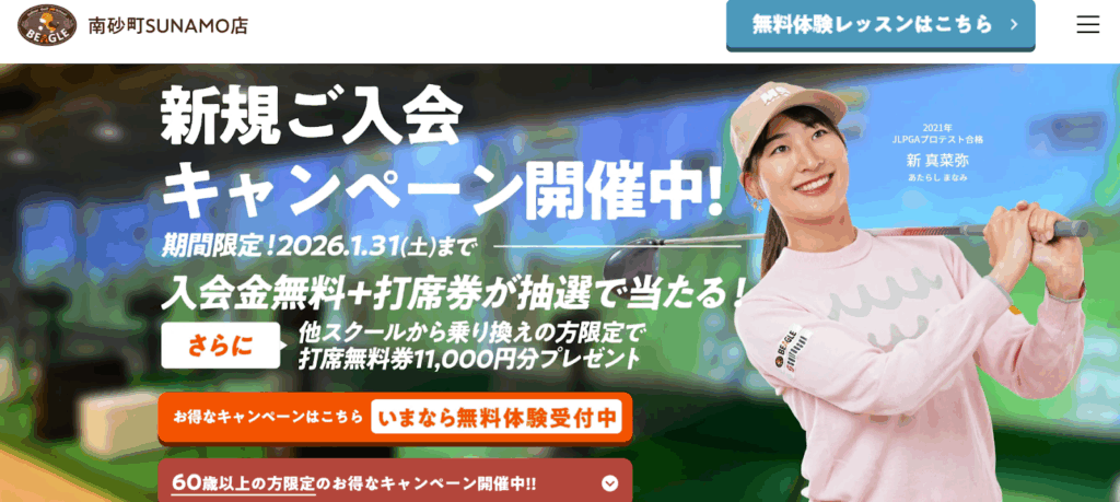 クラブやシューズの無料レンタルも用意されており、手ぶらで練習に利用可能です。