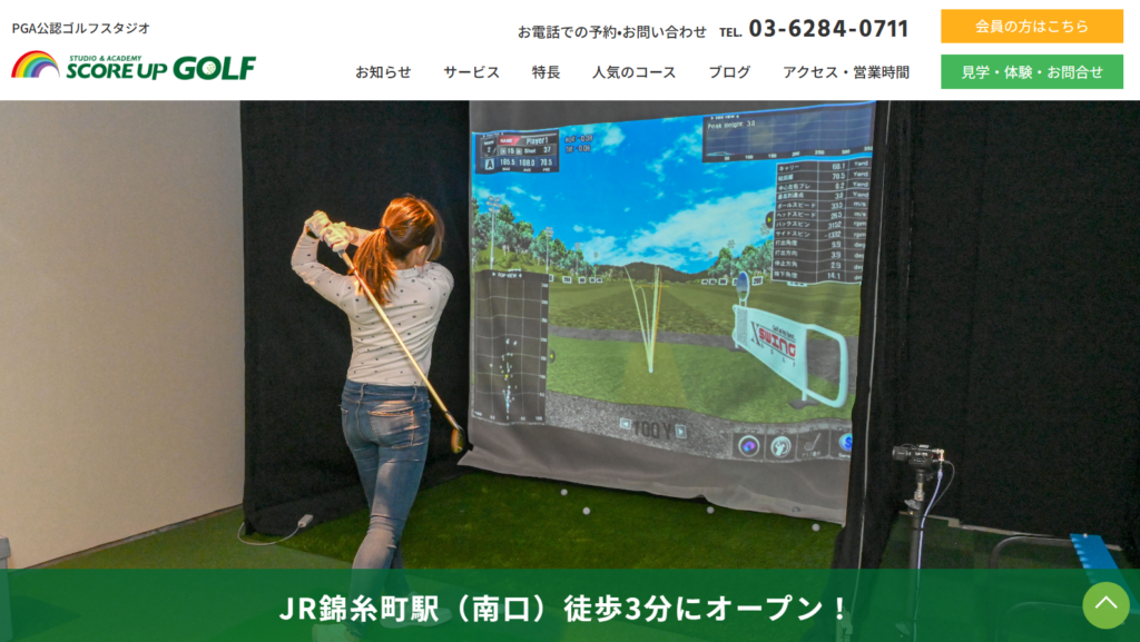 スコアアップゴルフ錦糸町は、錦糸町駅南口から徒歩約3分とアクセスが良く、PGAティーチングプロによる個人レッスンとシミュレーター練習を組み合わせながら、出勤前や仕事帰りにも通いやすいのが特徴です。
