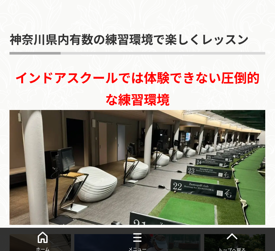 特徴 | ゴルフ練習場の広々とした施設を利用したレッスン。 |