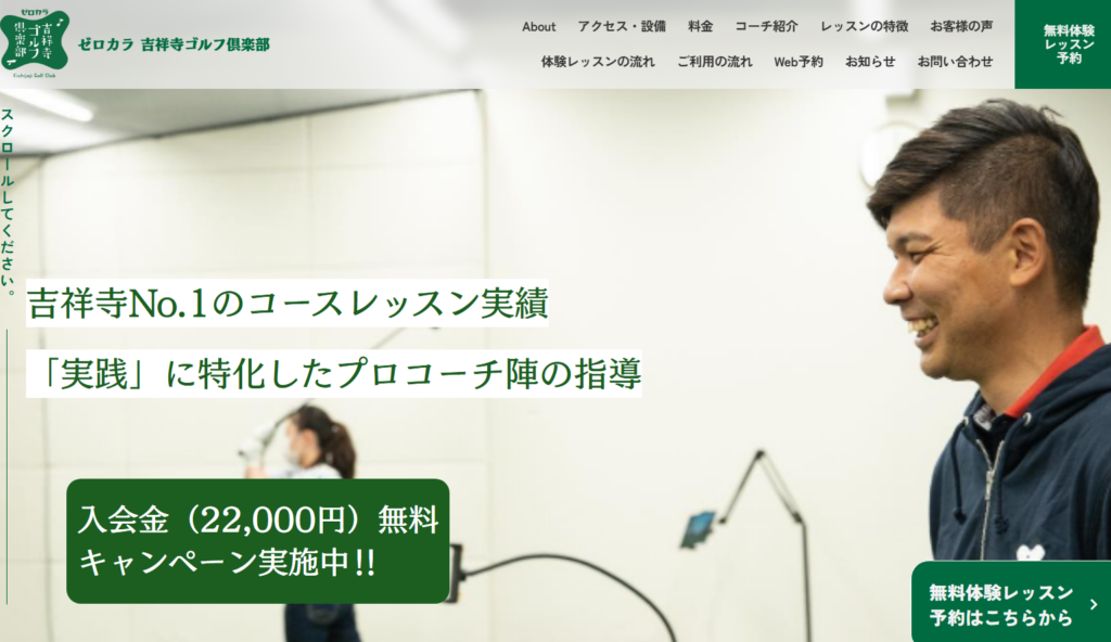 ゼロカラ吉祥寺ゴルフ倶楽部は、少人数制レッスンとコースレッスン実績の豊富さが強みで、吉祥寺周辺で実践的に上達したい方に向いています。