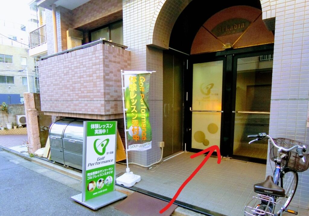 西麻布エリアの落ち着いた雰囲気のなか、ゴルフパフォーマンス六本木麻布店の看板が目に入ります。